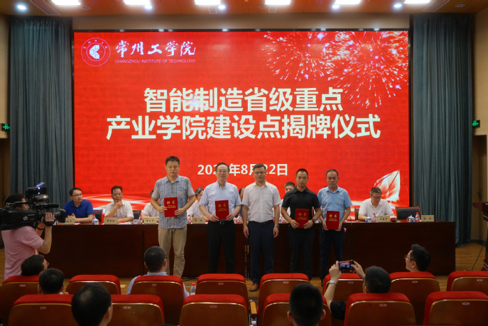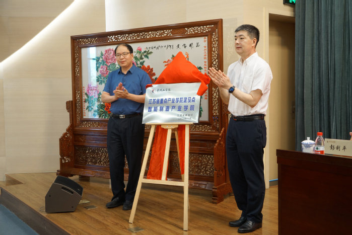邵进宣读了省级重点产业学院建设点遴选结果的通知,王成斌和陈正春共同为智能制造省级重点产业学院建设点揭牌。现场气氛热烈。