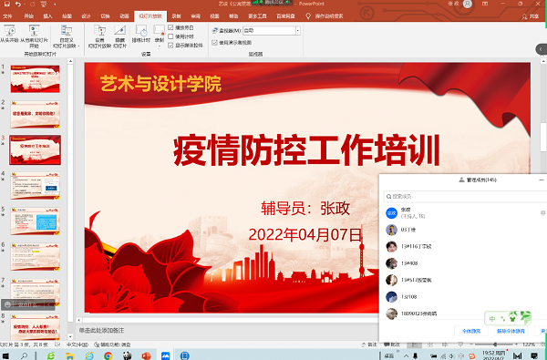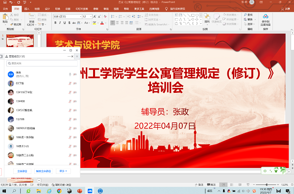 4月7日,艺术与设计学院在腾讯会议召开了关于宿舍公寓管理规定、疫情防控工作管理规定的线上培训会议。会议由学工办辅导员张政主持,学院全体宿舍长参加。