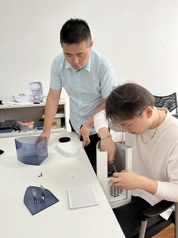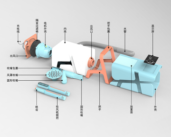 产品外观与内部结构都由学生自己设计完成,这是产品设计系在毕业设计环节的首次突破性尝试,也是企业导师在毕业设计中真正发挥作用的体现。常州市品臻工业产品设计有限公司总经理房刚,也是产品设计系的企业导师,与徐娟燕老师共同指导了三件毕业设计作品分别为:空净除湿一体机设计、宠物烘干箱设计、宠物吹水机设计。房总全程参与了毕业设计的指导工作,包括设计课题的拟定、外观方案的讨论、制造可行性研究以及结构设计的指导等等,确保毕业设计作品在外观有美感和创意的前提下,还要结构合理、制造可行、真正实现设计落地。