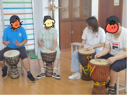 讲完小故事,就进入到了今天的正式活动——非洲鼓教学。非洲鼓训练在提高智力残障儿童的注意力、手眼协调力和集体模仿力等方面具有突出功效,通过开展非洲鼓教学,能让小朋友们学到规则和对节奏感的控制。今天我们的志愿者同学们为他们带来的教学曲目是《稻香》,前奏一响起,托养中心的小朋友们便激动地欢呼了起来,并随着音乐拍手,脸上洋溢着欢乐的笑容,沉醉在音乐和欢乐之中。志愿者同学们为小朋友们演示了一遍拍打手法,然后引导孩子们一起跟随着音乐节拍进行敲打。先从任意打鼓开始,然后到单手2拍、3拍、4拍,再到左右手交互打鼓,接着是左右手3拍、4拍、5拍,最后是结合歌声和身体律动的完整表演。志愿者们细心地为孩子们示范动作,并不时地走到他们身边握着他们的手进行耐心细致的一对一教学和辅助,帮助他们掌握敲打的技巧。