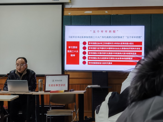 艺术与设计学院党委副书记陶骏以《把握新观点新论断新思想 深入学习领会党的二十大精神》为题,从大会主题、三个务必、三个大事、党的中心任务等十五个方面开展论述,为大家深入解读党的二十大精神。