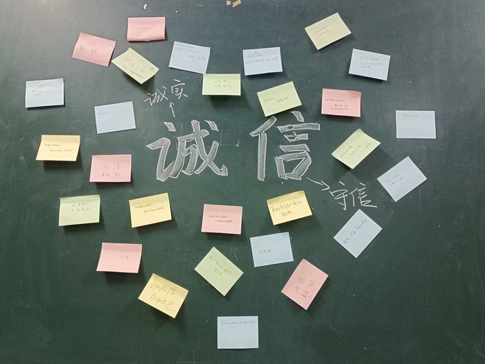 其中,22环境设计一班和三班学生联合开展了一场诚信主题的头脑风暴。同学们首先在纸上写下自己对诚信的理解,随后畅所欲言,对诚信的内涵、如何培养诚信观念、怎样坚持诚信做人等问题进行了探讨。大家认为,作为当代大学生,应从日常生活着手,做到诚信学习、诚信考试、诚信交友、诚信困难认定、诚信缴纳学费等。最后,同学们把想法贴在墙面,并手绘了诚信主题海报,进一步增强了此次班会的影响力。