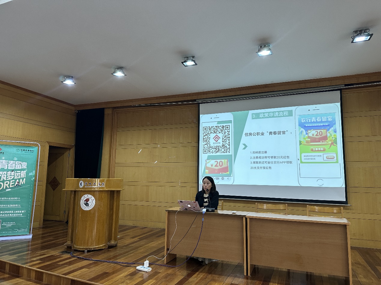 就业指导讲座上,就业辅导员郭煜锋为学生介绍了当前就业市场的形势和就业知识,着重围绕常见问题进行了答疑解惑,消除毕业生就业顾虑。活动还邀请了中国农业银行锦绣路支行负责人就“青春留常,筑梦远航”政策进行宣讲,鼓励同学们留常就业、为地服务,增强学生的就业自信心。