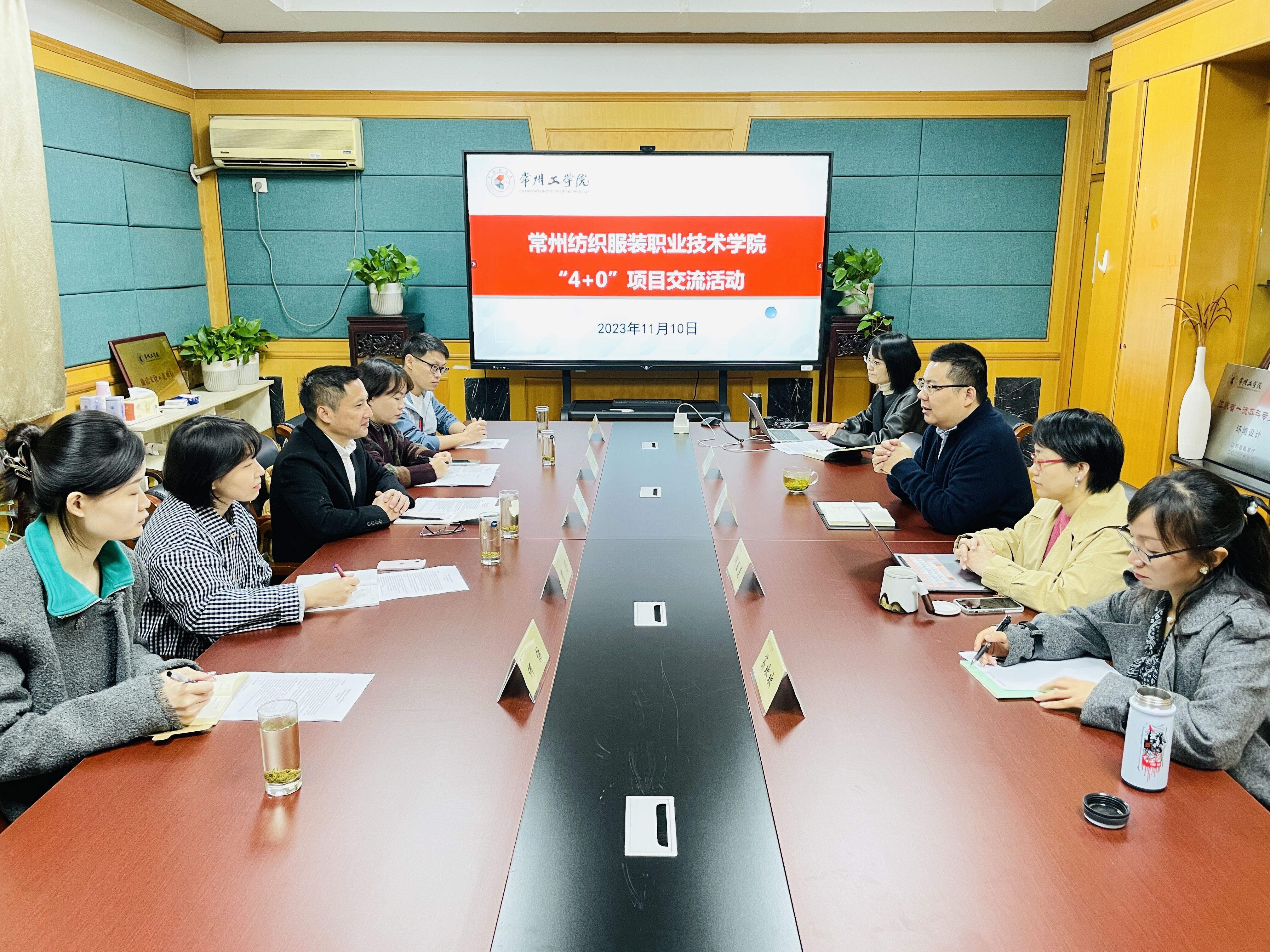 2023年11月10日,艺术与设计学院党委书记赵可恒、副院长何玉莲接待了常州纺织服装职业技术学院创意学院院长李方联一行6人,就“4+0”项目的人才培养和2024届毕业设计相关内容展开交流。