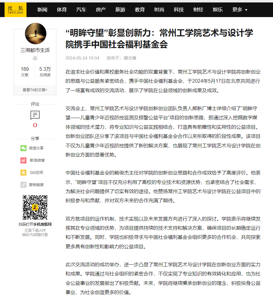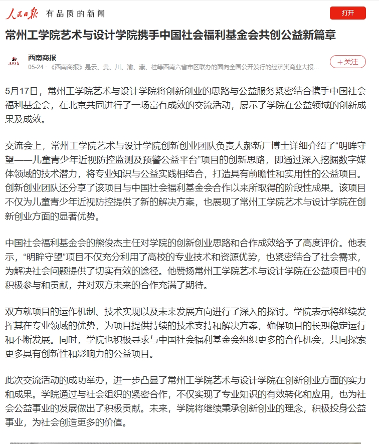 自5月18日起,《人民日报》、搜狐网、江苏网、苏南网等一系列主流媒体纷纷对本次创新创业公益行活动进行了全面深入的报道与转载。这些报道不仅有效提升了常州工学院艺术与设计学院的知名度与形象,进一步扩大了其在社会上的影响力,同时也激发了广大师生参与公益活动的热情与积极性,进一步增进了与合作伙伴之间的友好关系。此外,通过媒体的广泛传播,学校与社会的互动得到了有效促进,也成功吸引了更多潜在的合作伙伴和资助者的关注与支持。