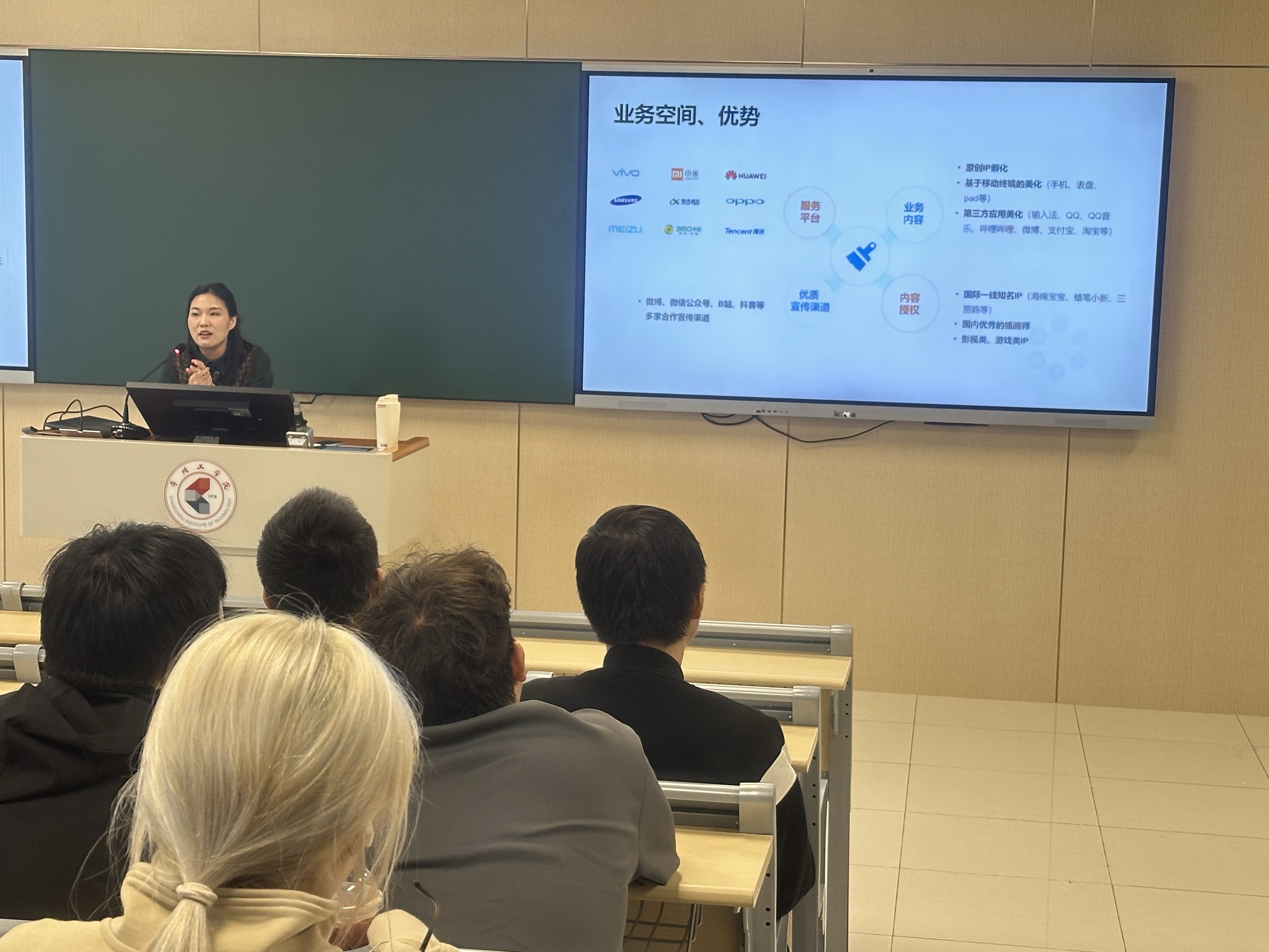 徐燕楠经理借助PPT和详细讲解,全面展示了麦拉风网络科技有限公司的业务领域。她向数字媒体艺术专业的学生们介绍了公司提供的多样化职位,包括动画设计、交互设计、数字绘画等,并强调了公司完善的培训体系和职业发展机会。此外,徐经理还分享了公司的办公环境、先进设备、薪资福利情况,以及公司重视员工健康和团队精神的企业文化。