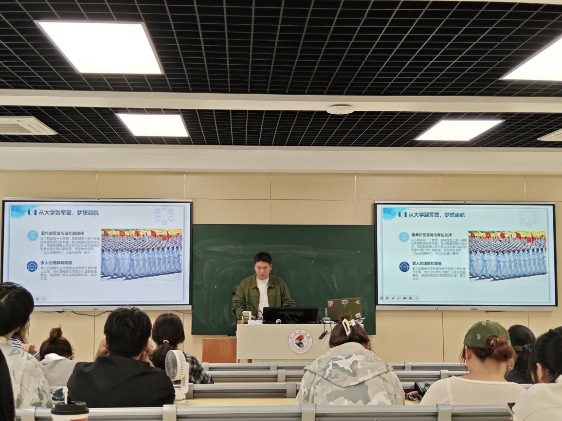 此外,活动特别邀请了两位退役同学进行军营经历分享。退役士兵罗梦雪和洪国翔通过亲身体验,讲述了军营中的成长与收获。两位同学的分享不仅让在场的同学们感受到军人的坚定信念,也为有参军意向的同学提供了宝贵的参考。