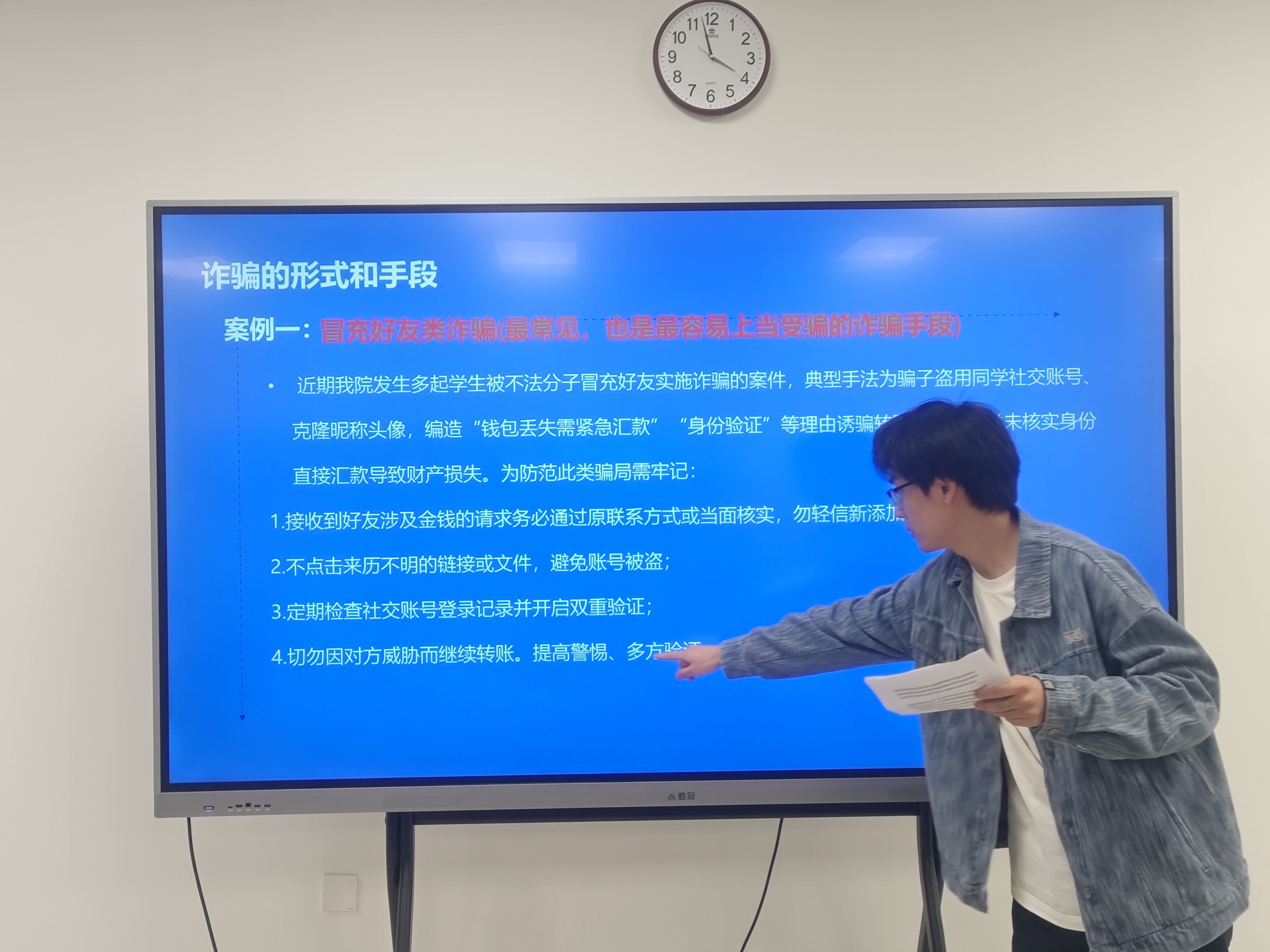 闫文罡在会上分析近期的诈骗案例,详细讲解不同类型诈骗手段和防范要点。他强调了提高警惕、增强防范意识的重要性,并介绍如何辨识常见的诈骗行为以及应对措施,提醒大家要保持警觉,避免成为诈骗的受害者。