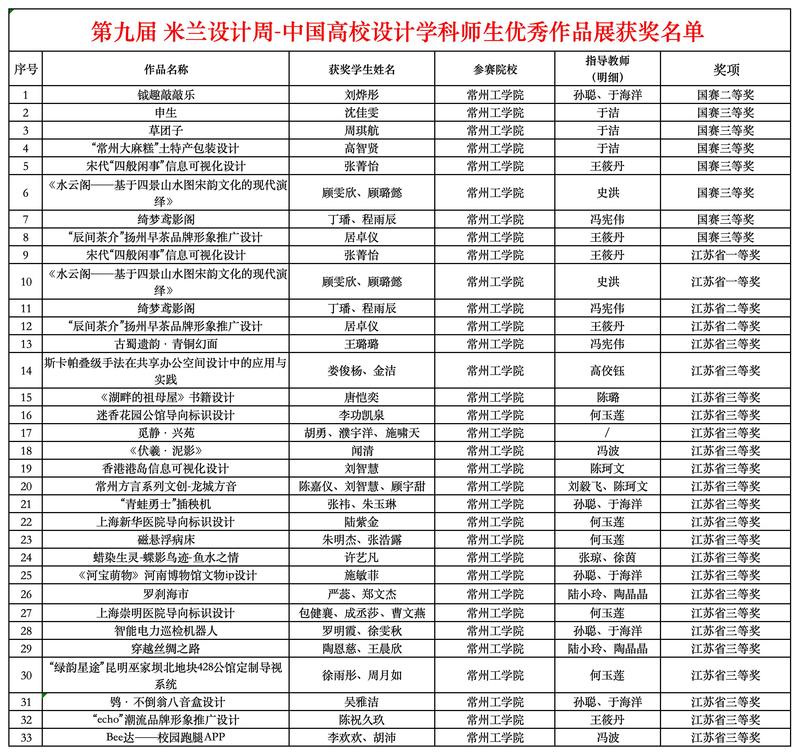 第九届米兰设计周—中国高校设计学科师生优秀作品展大赛已于2025年8月圆满落下帷幕。本届大赛共1759所高校参赛,作品共征集近27万余件,参赛师生人数达到38万人次。我校在江苏省级赛中荣获一等奖2项、二等奖2项、三等奖21项。进入国赛,我校再创佳绩,荣获得国家级二等奖1项、国家级三等奖7项。