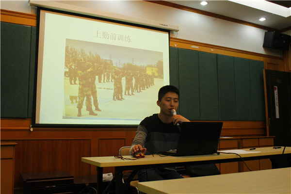 首先,退役特种兵沈佳洛同学播放了一段部队生活视频,并以“烈火锤炼 青春无悔”为主题为我们讲述了他的部队时光。接着,徐佳一同学诵读了已毕业的退伍军人宗瑛磊同学的文章《军旅无悔》。从两人的故事中,我们感受到了苦与累,也感受到他们对战友的怀念,对部队的尊敬,对这军中生活的无限珍惜。他们磨砺中学会了坚持,服从,忍耐与包容,这也是我们应该学习并拥有的优秀品质,我们应当向他们看齐,做一个对自己有要求的人。会议期间穿插了一场道德讲堂,为周末故事会画上了圆满的句号。