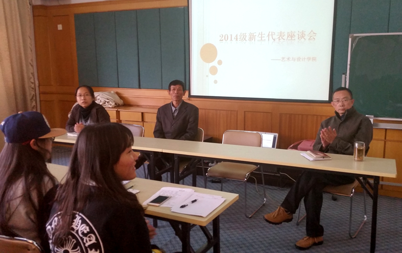 2014年11月3日,艺术与设计学院举行了2014级新生代表座谈会。会议由术与设计学院党委副书记罗兰英主持,党委书记薛锋、副院长温魏山以及各系辅导员老师、2014级各班新生代表参加了会议。