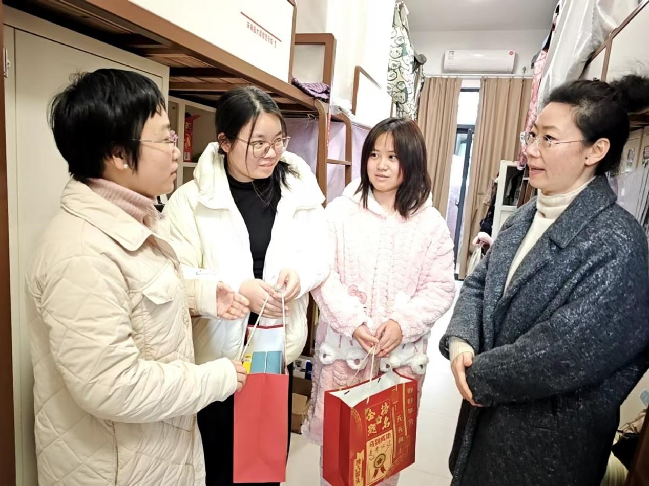 12月10日,学院全体党政领导和辅导员老师前往各个宿舍楼,关心考研学子,询问他们的生活状态和备考情况,并且将助研礼包交到每个学生手中,鼓励学生要保持良好的心态,合理安排复习计划,补充营养保证睡眠,以最佳状态迎接考试,并祝愿他们能顺利上岸。考研学子深受鼓舞,学生会倍加珍惜这份来之不易的学习机会,用优异的成绩回报学院的关爱。