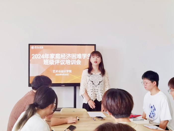 为规范和落实家庭经济困难学生的认定工作,确保资助工作公平、公正、公开的进行,9月20日中午,艺术与设计学院在元任楼B512召开家庭经济困难学生民主评议培训会。会议由资助辅导员张政主讲,全院班长参加。