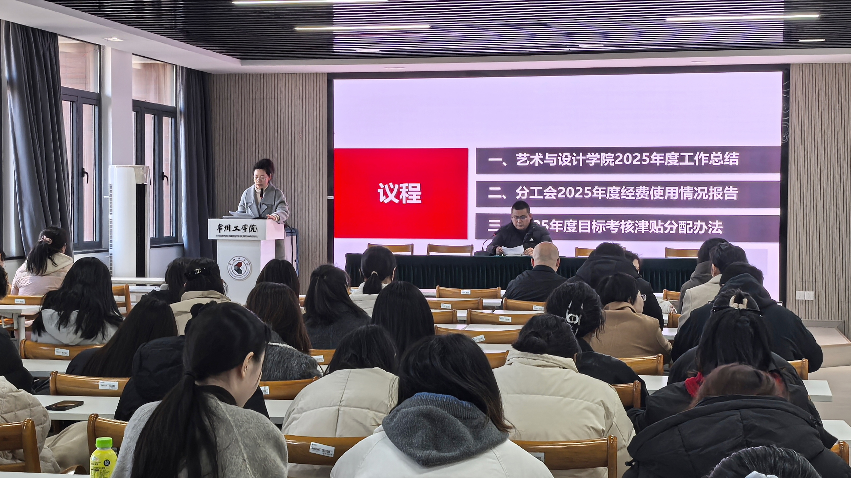会议听取院长徐茵所作的《艺术与设计学院2025年度工作总结报告》;听取了分工会主席郭琰所作的《艺术与设计学院2025年度分工会经费使用情况报告》;听取了《2025年度目标考核津贴、系部实验室主任补贴发放办法》。徐茵就办法中关键问题进行了现场解释与说明。全体与会人员以举手表决方式,一致通过这一办法。